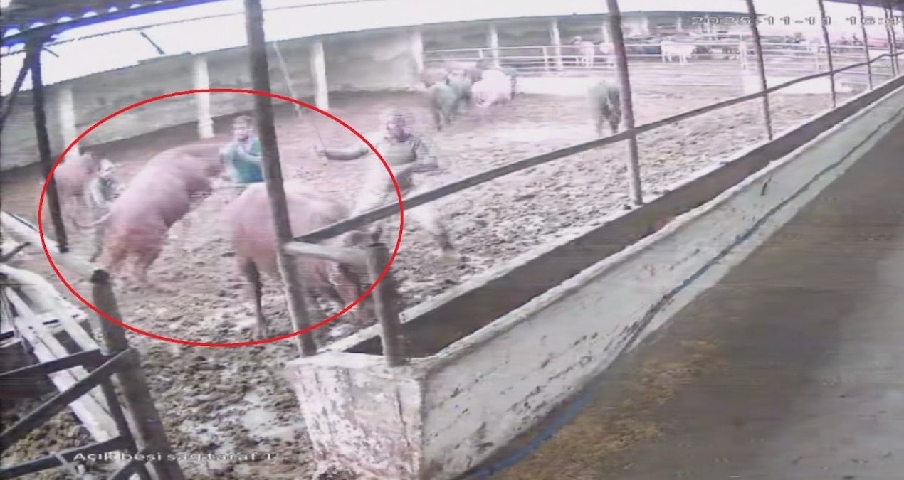 Amasya’nın Suluova ilçesinde büyükbaş hayvan yetiştiriciliği yapılan bir çiftlikte çalışan besici, hayvanları bir araya toplamak istediği sırada boğanın saldırısına uğradı. Boğanın aniden besicinin üzerine atladığı ve boynuz darbesiyle yere savurduğu anlar, çiftliğin güvenlik kamerası tarafından kaydedildi.